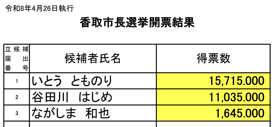 香取市長選挙2026は4月26日の20時で投票が締め切られました。