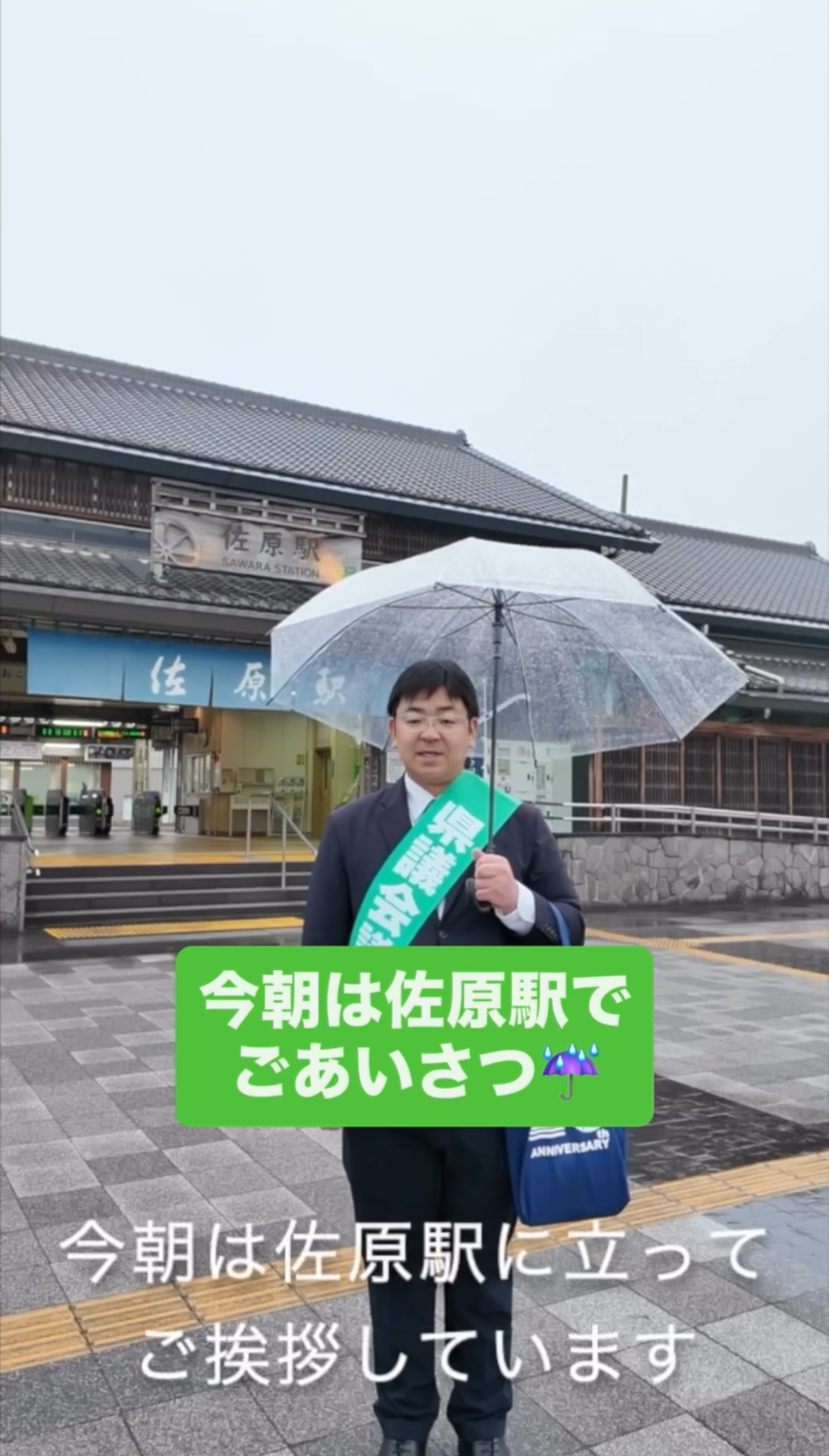 今朝は雨の佐原駅に立ってごあいさつ