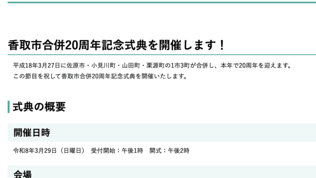 平成18年3月27日に佐原市・小見川町・山田町・栗源町の1市3町が合併し、香取市となってから今日で20周年を迎えることとなりました。20周年を記念して、3月29日には佐原文化会館で香取市合併20周年記念式典が開催されます。式典の様子はオンライン配信されるということです。https://www.city.katori.lg.jp/government/profile/gappei20th/20thshikiten.htmlこの20年に関して、市民のみなさんそれぞれに思いがあると思います。節目をみんなでお祝いして、次の10年、20年につなげていけるようにできればいいなと思います。