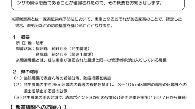 2026年1月26日、県内のうずら農場において、高病原性鳥インフルエンザが疑われる事例が発生したと報告を受けました。現段階では高病原性鳥インフルエンザが確定したわけではなく、現在、詳細な遺伝子検査を実施し、高病原性鳥インフルエンザの疑似患畜かどうか確認中という状況です。疑似患畜とは、家畜伝染病予防法において、患畜となるおそれがある家畜のことをいい、確定した場合、殺処分などの防疫措置を講じることとなります。これまでの経緯としては、1月26日の朝、旭市の農場主から東部家畜保健衛生所へ、死亡羽数増加の通報があり、東部家畜保健衛生所職員が農場へ立ち入り調査し、確認のため農場で簡易検査を実施したところ、簡易検査の結果が陽性と判明しました。飼養状況としては、うずら約10.8万羽を飼養しているということです。今後の千葉県の対応としては、疑似患畜と確定した場合、明日の朝から必要な対応を実施していくということです。なお、日本では、これまで家きん肉及び家きん卵を食べることにより、鳥インフルエンザウイルスが人に感染した事例は報告されていないということです。