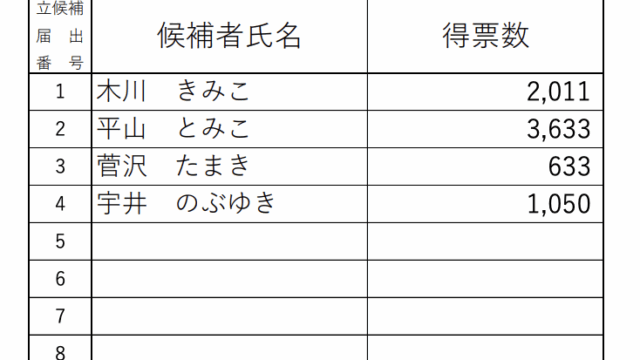 任期満了に伴う多古町長選2026は1月25日に投開票され、無所属で現職の平山富子氏が2期目の当選となりました。当日有権者数は11,034人で、投票率は67.02%となり、前回令和4年の選挙の62.50%より4.52ポイント高くなりました。各候補者の得票数は、届出番号順に以下の通りです。届出番号 候補者名(敬称略) 得票数1 木川きみこ 2,0112 平山とみこ 3,6333 菅沢たまき 6334 宇井のぶゆき 1,050