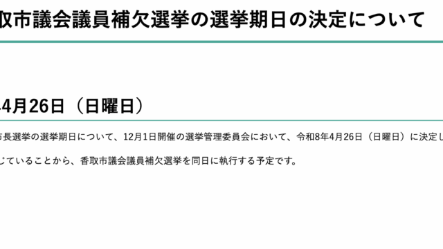 香取市長選挙2026と香取市議会議員補欠選挙は4月19日告示、4月26日の日曜日投開票に決定されました。令和8年4月29日任期満了に伴う香取市長選挙にあわせて、香取市議会議員の定数22に対して、現在3の欠員があることから、公職選挙法第110条4項2号により、香取市議会議員の補欠選挙(いわゆる便乗選挙)が行われる予定です。それにあわせて香取市長選挙と香取市議会議員補欠選挙の立候補予定者説明会が2026年3月24日(火曜日)午後2時から香取市役所4階の庁議室で行われることとなりました。立候補予定者説明会には立候補者及びその関係者が参加することができますが、1候補者につき3名以内とされています。どういった候補が香取市長選挙2026・香取市議会議員補欠選挙に立候補されるかは現時点ではわかりませんが、公平・公正な選挙が行われることを願います。